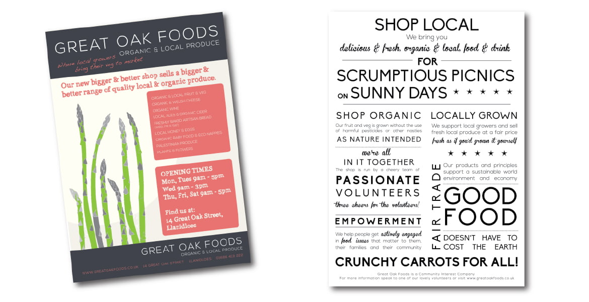 I have worked with Great Oak Foods on various projects since 2010. Most recently I collaborated with Zoe Quick on the redesign and rebranding of the new shop and premises. The job involved creating a new logo, branding, marketing materials, shop displays and shop signage.