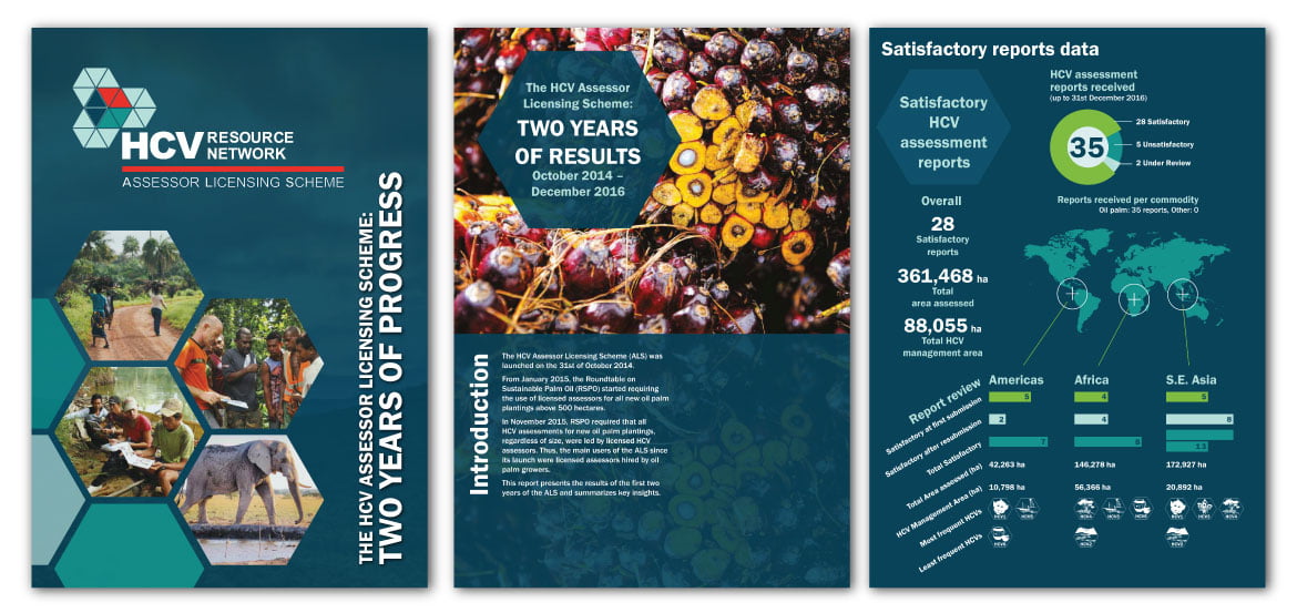 Annual report for HCV Resource Network. Rainforest protection licensing scheme. Brochure design including infographics.